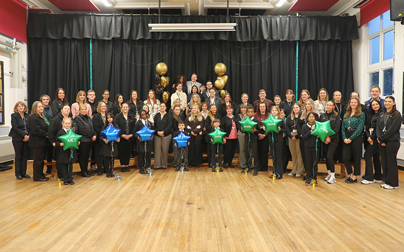 A group of pupils and staff at Goldsmith Primary Academy holding balloons/celebrating.
