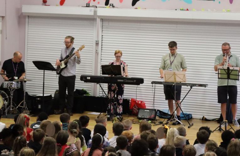 Over one week, the service visited 15 primary schools and between 3-4000 pupils delivering 45-minute live music performances to packed halls of enthusiastic pupils. The aim was to introduce children to the joy of live music, encourage musical curiosity, and raise awareness of the wide range of opportunities available through the local music service. Professional musicians from the team taught about rhythm and beat through covers of popular songs such as ‘Die with a Smile’ by Lady Gaga & Bruno Mars and ‘Firework’ by Katy Perry, along with old music standards that children may be unfamiliar with such as Dave Brubeck’s ‘Take Five.’
