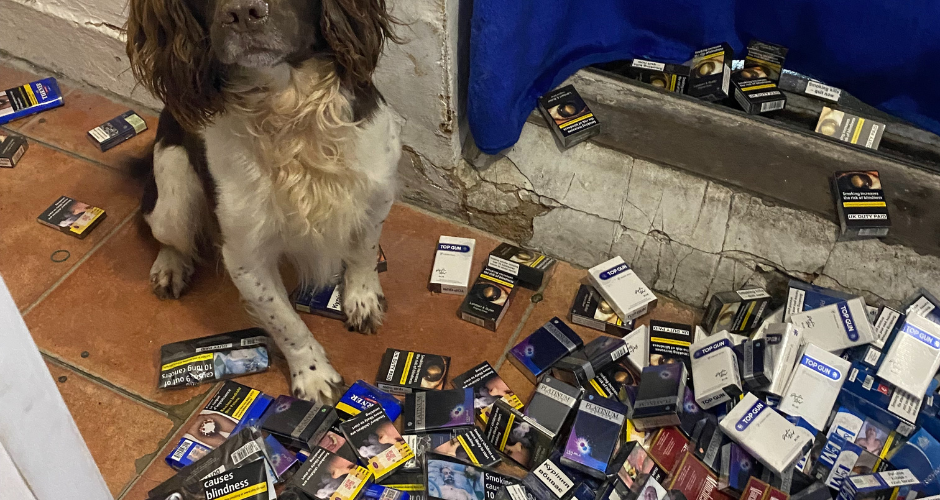 One store contained a purpose-built, magnetic concealment door hidden in the storeroom. Inside, officers uncovered over 2,000 illegal cigarettes. The sophisticated concealment would not have been located without the assistance of Griff the sniffer dog.